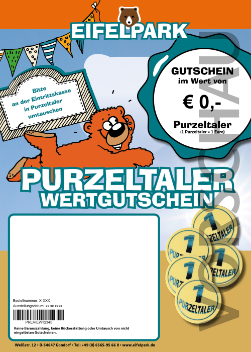 Wollen Sie z. B. den Eintritt für einen unvergesslichen Tag im Eifelpark verschenken und zusätzlich auch noch ein Taschengeld für den Ausflug in den Familien Freizeitpark, dann ist der Purzeltaler-Wertgutschein genau das Richtige!